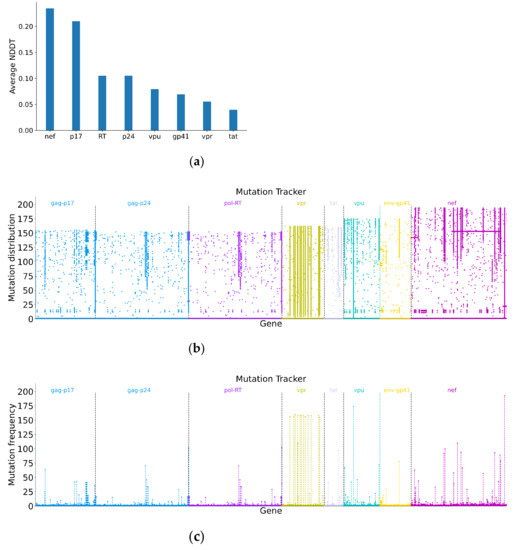 To better visualize the mutation distributions and frequencies of virus sequences over time in the same patients, we extend the Mutation Tracker method illustrated in [35,36] to present them. For the data of each patient, multiple gene sequences are aligned by MUSCLE [37,38], and a sequence at the first time point is regarded as the reference sequence. The aligned gene sequences are re-positioned and compared according to reference sequence. Gaps caused by insertion and deletion are also taken into account. Then, the mutation diversity of gene sequences is explored. Here, we assemble the mutation profiles of all genes without considering the noncoding region (the locations of the nine genes in the genomic sequence are presented in Figure 2a) and show the results in Figure 2b,c and Figures S11a,b–S19a,b. From the density of the dots in the figures, the changes in nucleotide distribution of the Env gene are the largest (the yellow dots are the densest when observed along the horizontal axis of Figure 2b and Figures S11a) and the mutation frequencies are the highest (the yellow bars corresponding to high mutation frequency are higher than others when observed along the longitudinal axis of Figure 2c and Figures S11b–S19b) compared with the reference sequence. This further validates the reliability of the conclusions obtained by NDDT.