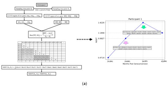(a) Flowchart for computing the mean NDDT between two adjacent time points and ; (b) Flowchart for computing the viral divergence and diversity between two adjacent time points and .