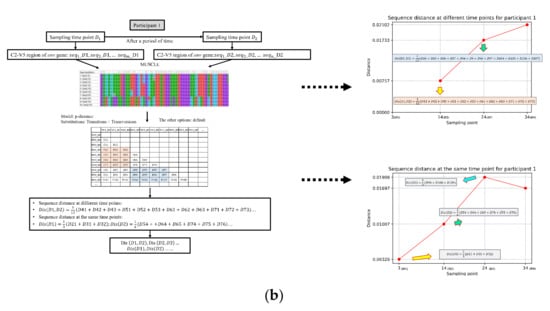 Since it is widely accepted that results based on Multiple Sequence Alignment (MSA) are reliable, we calculate the genetic distance based on MSA at different time points or the same time point, and check whether the NDDT and the genetic distance are statistically indistinguishable, which would further support the interpretation that the NDDT and the mutation rate are strongly linked. Here, the mean genetic distance is used. The calculation flowchart in Figure 4b is described by taking participant 1 as an example, who has three sequences at time point D1, four sequences at time point D2, and three sequences at time point D3. MUSCLE is used to carry out multiple sequence alignment and the pairwise nucleotide distances among these 10 sequences are calculated. We choose the model as “p-distance”, the substitutions as “Transitions + Transversions”, and the other options by default. The above steps are implemented by MEGAX [39]. Then, a genetic distance matrix among these 10 sequences is obtained. Similarly, we compute the average distance of sequences at the current time point or the adjacent time points. Then, we can obtain insight into viral divergence and viral diversity. The viral divergence at a given time point is defined by the distance between the current time point and its previous time point, and the viral diversity at the given time point is estimated by the average genetic distance for pairwise sequences at the current time point.