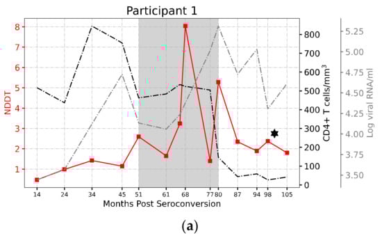 The above results are consistent with the changes in T-cell levels and viral counts. Participants 1 and 2 had high CD4+ T cell levels at the infection stage, and their NDDTs change very slowly. Participants 9 and 11 were the slowest disease progressors. The CD4 count of participant 9 was still over 200 cells/μL at the last study time point whose antiretroviral therapy began when the CD4 measure was 202 cells/μL. In the meanwhile, the mutation rate of participant 9 goes down during the initial 63 months (~5.5 years) post seroconversion, and upward after that until the last time point, which suggests that this participant was going through the disease stage. Participant 11 never received any antiretroviral therapy during all study time points, and had the highest protracted CD4 count decline. The cell count and viral load were stable for about seven years, and then were inevitably followed by a decline in CD4 and a rise in viral phenotypes in 70 months after seroconversion, which indicates that participant 11 entered the stage of disease progression.