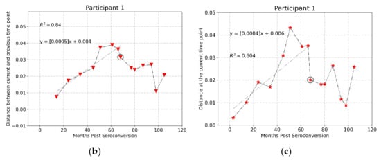 For participant 1, there are fifteen sampling time points—3, 14, 24, 34, 45, 51, 61, 66, 68, 77, 80, 87, 94, 98, and 105—whose unit is a month. There is more than one nucleotide sequence at each time point, and the length of the sequences at the same time point may be different. We first convert each sequence into a natural vector and then calculate NDDT. In this way, we obtain a mutation matrix and only consider the mutation sub-matrices of adjacent time points. Next, we take the average of the sub-matrix and obtain a mean mutation rate between time point and time point . For each participant, we calculate the mean mutation rate between time points and , and plot it at (Figure 4a).