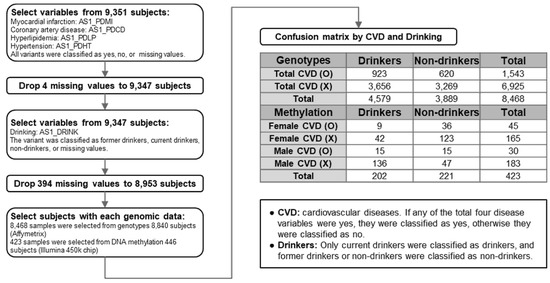 This study investigated the genetic and epigenetic risk factors of CVDs [27]. We divided the subjects into two groups based on the incidence of CVDs (myocardial infarction, coronary artery, hyperlipidemia, and hypertension) and an absence of CVDs. A flowchart of how subjects for genotype and methylation analyses were selected from 9351 participants is presented in Figure 1. As a case–control study, we compared drinkers and non-drinkers in the two groups, CVD and non-CVD groups. We then identified the frequently detected genotypes and epigenotypes via association studies.