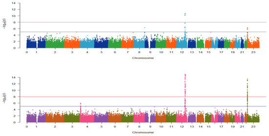 The GWAS results between drinking status were summarized as top three most significant SNPs in two separated groups (Table 1) and visualized as two Manhattan plots (Figure 2). CVD had the lowest odds ratio (OR) of 0.2402 in rs2074356 belonging to HECTD4, which was the most significant genotype. On the contrary, without CVD, rs2074356 was also the most statistically significant genotype. Therefore, HECTD4 showed statistically significant values in both classes. The top three genotypes were in the same order by OR (Table 1). In the Manhattan plot of the CVD group, a region with −log10 (p-value) > 8 was found on chromosome 12, and a region with log10 (p-value) > 5 was found on chromosome X (Figure 2, top). In the Manhattan plot of non-CVD group, a region with −log10 (p-value) > 8 was found on chromosomes 12 and X, and a region with log10 (p-value) > 5 was found on chromosome 4 (Figure 2, bottom). The two groups showed a similar pattern but a more significant statistical difference because more subjects were included in the non-CVD group.