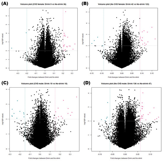 Volcano plot of differentially methylated regions (DMRs) indicating difference between four pairs of four groups. Total 423 subjects were divided into four groups based on the cardiovascular diseases (CVDs) (at least one of myocardial infarction, coronary artery, hyperlipidemia, and hypertension) or non-CVDs, and sex (male or female). (A) In females with CVD, t-test was performed on nine drinkers versus 36 non-drinkers, and 19 DMRs were found to satisfy the criteria |fold change| > 0.2 and p-value < 0.01. (B) In males with CVD, t-test was performed on 15 drinkers versus 15 non-drinkers, and 22 DMRs were found to satisfy the criteria |fold change| > 0.15 and p-value < 0.01. (C) In females with non-CVD, 42 drinkers versus 123 non-drinkers and 19 DMRs satisfied the criteria |fold change| > 0.09 and p-value < 0.01. (D) In females with CVD, the pairs of 136 drinkers versus 47 non-drinkers were subjected to t-test, and 27 DMRs satisfied the criteria |fold change| > 0.06 and p-value < 0.01. In the volcano plot, higher methylated regions between drinkers and non-drinkers of four groups are indicated as pink dots.