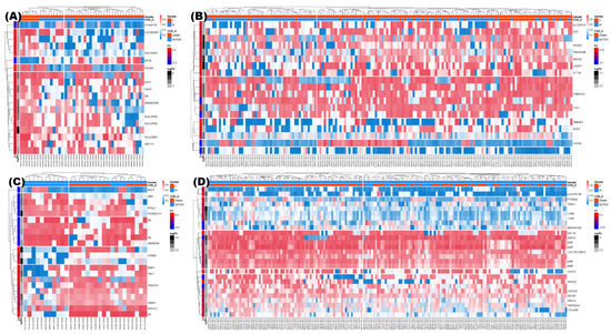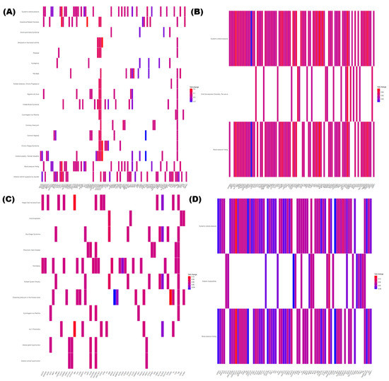 Gene-concept heatmap of the DMRs indicating the difference between four pairs of the four groups. The X-axis represents each gene, and the Y-axis represents the terms corresponding to each gene. Color ranges from red (high methylated in drinkers) to blue (high methylated in non-drinkers). (A) In females with chronic cardiovascular diseases (CVDs), the pairs of 9 drinkers versus 36 non-drinkers were included in the enrichment test, and each term satisfying the criteria |fold change| > 0.08 and p-value < 0.05 was retrieved. (B) In males with CVD, the pairs of 15 drinkers versus 15 non-drinkers were included in the enrichment test, and each term satisfying the criteria |fold change| > 0.08 and p-value < 0.05 was retrieved. (C) In females with non-CVD, the pairs of 42 drinkers versus 123 non-drinkers were subjected to the enrichment test, and each term satisfying the criteria |fold change| > 0.04 and p-value < 0.05 was retrieved. (D) In males with non-CVD, the pairs of 136 drinkers versus 47 non-drinkers were subjected to the enrichment test, and each term satisfying the criteria |fold change| > 0.04 and p-value < 0.05 was retrieved.