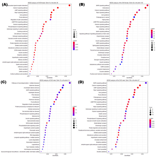 Enriched KEGG pathways of the DMRs indicating the difference between four pairs of the four groups. The top 30 enrichment KEGG pathways for DMRs satisfying the criteria p-value < 0.05 in each of the four pairs are presented. Color of the plot represents the p-value, and the size represents the count of genes. (A) In females with chronic cardiovascular diseases (CVDs), the pairs of 9 drinkers versus 36 non-drinkers were compared. (B) In males with CVD, the pairs of 15 drinkers versus 15 non-drinkers were compared. (C) In females with non-CVD, the pairs of 42 drinkers versus 123 non-drinkers were compared. (D) In females with CVD, the pairs of 136 drinkers versus 47 non-drinkers were compared.