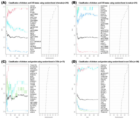 Random forest analysis results classifying the four groups from 423 samples. Each of the four random forest outputs was provided as an error plot and variable importance plot. Three conditions (sex, drinking, and chronic cardiovascular diseases; CVDs) were considered as criteria for classification. Subjects afflicted with at least one of the diseases, including myocardial infarction, coronary artery, hyperlipidemia, and hypertension, were included as subjects with CVDs. Variable importance plot of the random forest analysis resulted from the integration of a large number of models built by classification of each of the four groups. The variables are ordered top-to-bottom as most-to-least important in classifying the four groups. The ranked list of variables indicates the importance of each variable in classifying the data. The figure shows the top 30 variables important in the classification of the four groups. Four groups were divided based on the drinking and CVD status (A) from 210 female samples and (B) from 213 male samples. Similarly, four groups each were divided based on the drinking status and sex (C) from 75 CVD samples and (D) from 348 non-CVD samples.