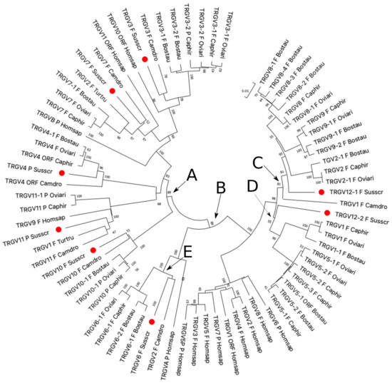 The neighbor-joining (NJ) tree inferred from the pig, sheep, goat, bovine, dromedary, dolphin, and human TRGV gene sequences. The evolutionary analyses were conducted in MEGA X [25,26]. The optimal tree with the sum of branch length = 5.56210337 is shown. The percentage of replicate trees in which the associated taxa clustered together in the bootstrap test (100 replicates) is shown next to the branches [37]. The tree is drawn to scale, with branch lengths in the same units as those of the evolutionary distances used to infer the phylogenetic tree. The evolutionary distances were computed using the p-distance method [28] and are in the units of the number of base differences per site. This analysis involved 45 nucleotide sequences. Codon positions included were 1st + 2nd + 3rd + Noncoding. All ambiguous positions were removed for each sequence pair (pairwise deletion option). There was a total of 349 positions in the final dataset. Each pig TRGV gene is marked with a red circle. The branches highlighted by the letters group mammalian genes described in the text. The gene functionality according to IMGT rules (F: functional, ORF: open reading frame, P: pseudogene) is indicated. The IMGT 6-letter for species (Susscr, Bostau, Oviari, Caphir, Camdro, Turtru, and Homsap) standardized abbreviation for a taxon was used.