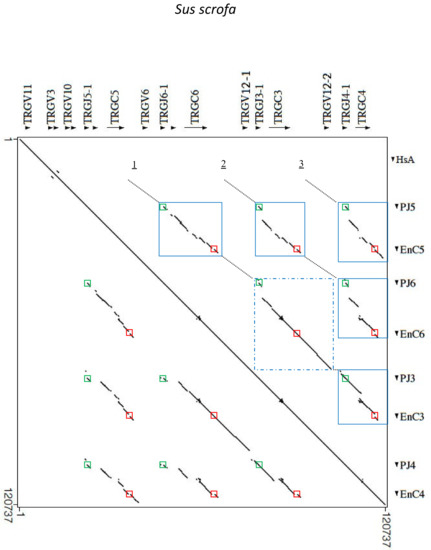 Moreover, computational analysis of the pig TRG locus was conducted using the RepeatMasker for the identification of genome-wide repeats and low complexity regions (Smit, A.F.A., Hubley, R., Green, P. RepeatMasker open-4.0. at http://www.repeatmasker.org, accessed on 20 December 2021) and Pipmaker [19] for the alignment of the determined pig sequence with itself. The inspection of the obtained dot-plot matrix allowed us to identify portions of the sequence that align with more regions within the sequence itself.