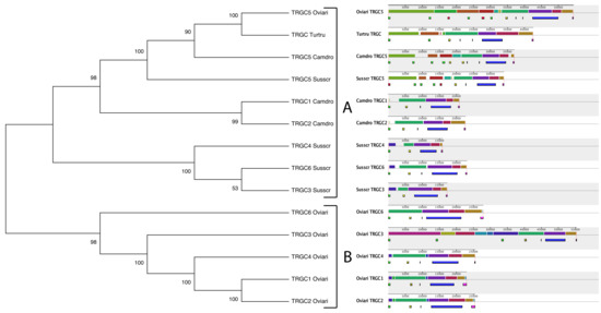 The tree resolved the sequences into two main branches (A and B). Generally, all the cassette sequences group in a species-specific manner. The only exceptions are the pig, sheep, and dromedary TRGC5 cassettes and the dolphin TRGC single one, which form a monophyletic group within branch A, highlighting how the high level of conservation during the evolution of the different lineages affected not only the TRGC (Figure 4) and the TRGV (Figure 2) genes present in those cassettes but the entire genomic sequences of the same cassettes. This confirms, once again, the ancient origin of these cassettes.