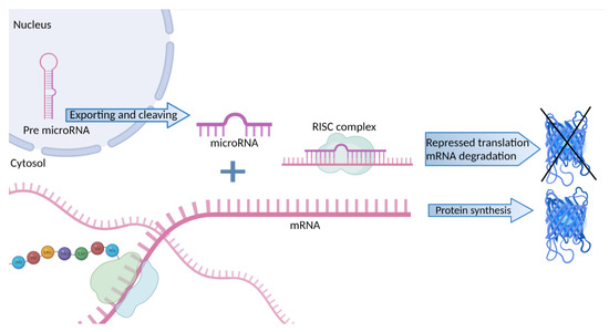 Schema of the regulation of protein synthesis through microRNA binding leading to mRNA degradation and downregulation of translational processes. Created with BioRender.com, accessed on 2 December 2021.