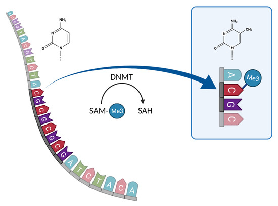 Schema of cytosine methylation by SAM in CpG positions. Created with BioRender.com, accessed on 2 December 2021.