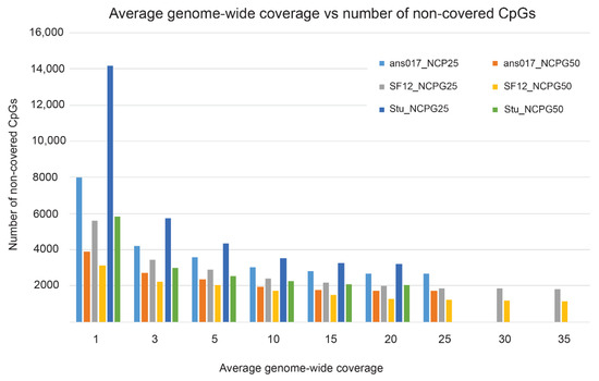 Number of non-covered CpG positions in relation to the average genome-wide coverage. Please note that the maximum average genome-wide coverages per individual are as follows: ans017—24×, SF12—38×, and Stuttgart (Stu)—19×, respectively.