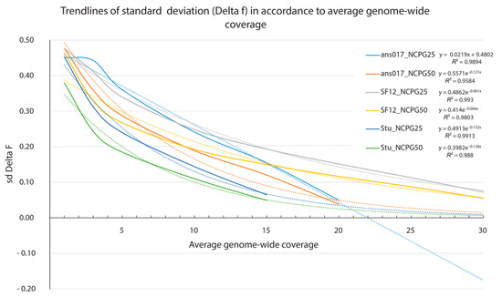 Standard deviations of Delta f in relation to the average genome-wide coverage. Trendlines are shown as dotted lines and the respective equations with accompanied R2 values are listed in the legend.