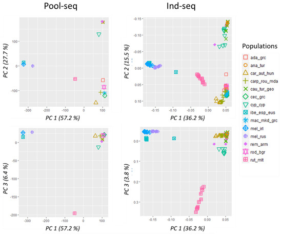 4.3. Near Identical Inference of Population Structure and Diversity by Pool-Seq and Ind-Seq