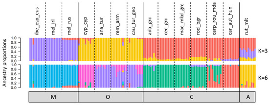 - Kopelman, N.M.; Mayzel, J.; Jakobsson, M.; Rosenberg, N.A.; Mayrose, I. Clumpak: A program for identifying clustering modes and packaging population structure inferences across K. Mol. Ecol. Resour. 2015, 15, 1179–1191. [Google Scholar] [CrossRef] [Green Version]