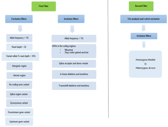 We only kept the SNV and indel gene variants with an allele frequency <1% in the Database of Genomic Variants (DGV) in the UCSC Genome browser. Then, all intergenic, intronic, non-coding, splice region, synonymous, downstream, and upstream variants were excluded. Deleterious variants obtained from exonic frameshift, damaging missense, splice donor and acceptor, stop codon gained and lost, and in-frame deletions and insertions were retained (Figure 1). In addition, the variants with a read depth of less than 20 and a variant allele frequency of less than 35% of the normal allele (proportion of variant reads) were removed. Furthermore, trio analysis and cohort exclusion were performed on the remaining gene variants by assuming a de novo, autosomal recessive, and X-linked mode of inheritance.