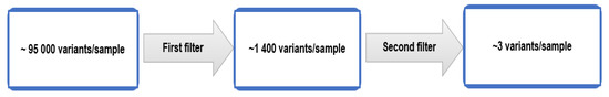 Number of variants obtained by WES after 2 filtering steps. Around 1400 variants/subject remained after applying the first filter and around 3 variants/subject remained after the second filter.