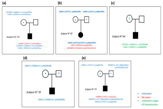 Pedigrees of the 5 subjects. (a) In subject number 23, 2 SNVs were inherited from the mother and 1 SNV was de novo. (b) In subject number 45, 1 SNV was inherited from both parents and 1 SNV and 1 deletion were de novo. (c) In subject number 64, 2 SNVs were detected on chromosome X. (d) In subject number 70, we detected 1 inherited SNV on chromosome 18 in the ASXL3 gene. (e) In subject number 73, 1 SNV and 1 insertion were inherited and 1 SNV was de novo. Blue color represents the inherited variants, red color represents the de novo variants and green color represents the variants with unknown origin of transmission.