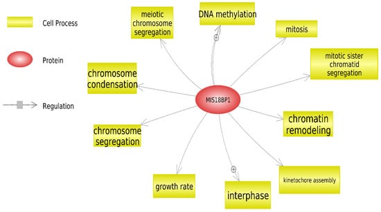 Since de novo gene variants have been considered a major cause of early-onset genetic disorders such as ASD [19], Pathway Studio software v12.3 (https://mammal.pathwaystudio.com/, accessed on 24 September 2020) was used to identify the cell processes related to the encoded protein of the novel de novo mutation in the MIS18BP1 gene detected in our study. A biological network was created by integrating MIS18BP1 gene in the software and the encoded protein was connected to its related cell processes (Figure 4).
