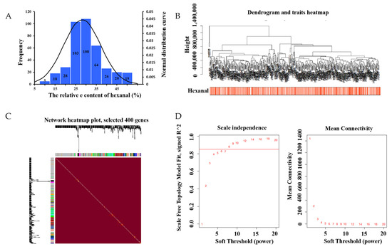 (A) Phenotypic distribution of 398 samples. Histogram of the frequency distribution of hexanal (%). The black line represents the normal distribution curve. (B) Dendrogram and traits heatmap. (C) Clustering dendrograms of genes, with dissimilarity based on topological overlap, together with the assigned module colors. Genes that could not be clustered into one of the two modules are labeled in gray. (D) Scale independence and mean connectivity.