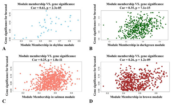 Scatterplot of module membership and gene significance showing correlation between different modules and hexanal. (A) Skyblue module; (B) Darkgreen module; (C) Salmon module; (D) Brown module.