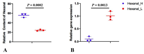 Volatile organic compounds (VOCs) are the key constituents of meat aroma and flavor and advance the cognition of meat quality [1]. Therefore, it is important to study the changes of VOCs in meat to understand the flavor formation pathway. Hexanal, the main aroma active compound in aromatic rice milk [2] and pea milk [3], was found to be strongly correlated with lipid oxidation [4] and its relative content was increased with the storage time of the samples [5]. Chicory-fed lambs had higher hexanal content and better flavor than ryegrass-fed lambs [6]. Our previous analysis of the volatiles detected in the breast muscle of nearly 1000 different breeds of yellow-feathered broiler chickens revealed that hexanal is also the major volatile substance in chicken meat [7]. Therefore, further study of hexanal content in chicken is necessary.