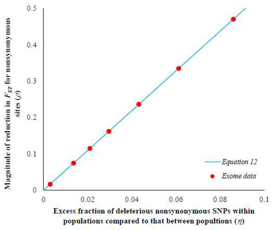Equation (12) shows the theoretical relationship between ρ and η. However, using Equation (11), ρ can be empirically estimated for the exome data using the estimates of FST at neutral (ST(S)) and constrained sites (ST(N)).