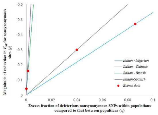 The theoretical relationship between the excess in the fraction of deleterious mutations segregating within population and those between populations (η) and the magnitude of the reduction in the FST estimates of nSNPs (ρ) using Equation (12) (see Materials and Methods). Neutral population diversities based on sSNPs for within- and between-population comparisons of the Italian–Nigerian, Italian–Chinese, Italian–British, and Italian–Spanish pairs were used to plot the lines, and the ρ estimated from the exome data (using Equation (11)) are shown as red closed circles. The theoretical lines were used to predict the η values of the corresponding ρ estimated using the exome data.