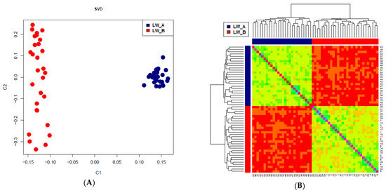 SVD (A) and Heatmap (B) for pigs LW_A and LW_B. (LW_A—Large White Russian selection, LW-B—a commercial Large White).