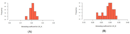 Implemented autozygosity in pigs. ((A)—distribution of the values of the inbreeding coefficient for LW_A; (B)—distribution of the values of the inbreeding coefficient for LW_B).