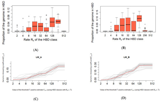 The class Rk = 128 contributed greatly to autozygosity in LW_B (proportion of the genome about 0.1) (Figure 4A,B; additional Table S2). Herewith, the contribution of the classes Rk = 128 (0.05) and the class Rk = 256 (0.05) can be traced in LW_A. Variations in individual levels of autozygosity in both groups did not deviate much from the midline (Figure 4C,D). HBD class Rk = 512 was absent in all pigs in the study groups.