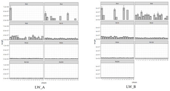 In general, LW_A had 13,338 HBD segments, an average of 171 per animal; LW_B has 15,747 HBD segments, an average of 181 per animal. The largest length of HBD segments was determined for LW_A (138.52 Mb, 1759 Number SNP, SSC1). The average length of HBD segments for LW_A was about 2.47 Mb (54 Number SNP), for LW_B 3.41 Mb (77 Number SNP). The average length of HDB segments on chromosomes (taking into account different classes) is shown in Figure 5. Segments of the Rk = 2 class were determined only in pigs from the LW_A group. These segments were located in SSC1, and their average length was 108.67 Mb. Segments of class Rk = 4 for LW_A were defined at SSC1, SSC2, SSC4, SSC5, SSC6, SSC9, SSC13, SSC17; LW_B has SSC1, SSC2, SSC8, SSC9, SSC13, and SSC15. HBD segments of class Rk = 8 were absent in LW_A on SSC10 and in LW_B on SSC10 and SSC16. Starting from Rk = 16 and further up to Rk = 256, HBD segments were relatively evenly distributed on all chromosomes in LW_A and LW_B.