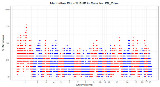 When searching for selection signatures, the FST method is extremely interesting. Value FST is a differentiation measure between populations [11]. The FST locus value is calculated as the ratio of the variance of allele frequencies between populations and the sum of variances within and between populations. The locus with more significant values of FST in comparison with other loci may indicate positive selection [12,13]. To date, various modifications of this method have been presented, but undoubtedly, it remains the most widespread and reliable one to identify genome traits of selection signatures between observable populations [14,15].