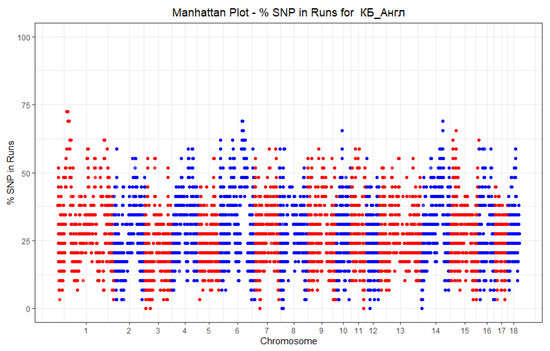 The SNP frequencies (%) in the detected HBD were estimated for each group of pigs and plotted against the position of the SNP in the autosomes (Figure 6 and Figure 7).