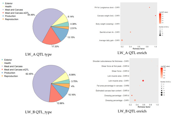 In both groups, the top HBD areas overlapped with QTLs, among which the most represented were the signs of Meat and Carcass traits (Figure 8). In pigs LW_A, relative to LW_B, the QTL type of Exterior, Health and Production was more represented. In LW_B pigs, QTL Reproduction was more represented. Using the analysis of QTL enrichment in the top HBD, LW_A had the most represented characteristics: Ph Logissmus Dorsi, carcass weight (hot), body weight (weaning), backfat at last rib, average daily gain. LW_B has shoulder subcutaneous fat thickness, shear force, loin muscle area, fat area percentage in the carcass, estimated carcass lean content, and dressing percentage.