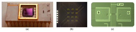Photographic image of the entire “silicon-on-insulator”-based nanosensor (SOI-NS) sensor chip (a); optical image of the SOI-NS sensor chip with an array of 12 nanowire (NW) sensors (b); optical image of a single nanosensor (NS), which is located between source (S) and drain (D) contact areas (c). The central area of the chip with the array of NW NSs is to be in contact with the analysed liquid sample during measurements.