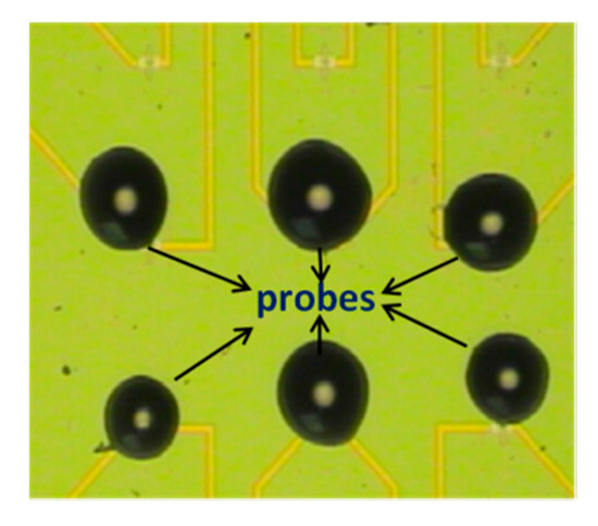 oDNA molecular probes were covalently immobilized onto the APTES-modified surface of the sensor chip via DTSSP crosslinker using the technique reported in our previous papers [33,34,35,36,37]. The concentration of the oDNA probes in the immobilization solution, prepared using 50 mM potassium phosphate buffer (pH 7.4), was 1 μM. The oDNA probes were immobilized on the surface of individual nanosensors by precisely dispensing ~2 nL microdrops of the immobilization solutions onto the individual nanosensors with an iONE spotter (M2-Automation GmbH, Berlin, Germany) equipped with a piezo-driven PDMD micro-dispenser (M2-Automation GmbH, Berlin, Germany). The microdrops of the oDNA solutions were incubated on the NS surface for 30 min at 5 °C in a humid chamber and then washed away with deionized water and dried under nitrogen. Figure 2 displays optical image of the microdrops on the sensor chip surface.