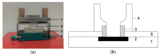 Analytical unit of the “silicon-on-insulator”-based nanosensor. (a) Photographic image of the analytical unit. Numbers indicate the main elements of the unit: 1—pressing mechanism; 2—measuring cell; 3—sensor chip with a polystyrene cover; 4—sensor chip holder. (b) Schematic of the analytical unit without the pressing mechanism. Numbers indicate the elements of the unit: 1—sensor chip; 2—sensor chip crystal bearing an array of nanowires; 3—polyvinyl chloride gasket; 4—measuring cell; 5—polystyrene cover.