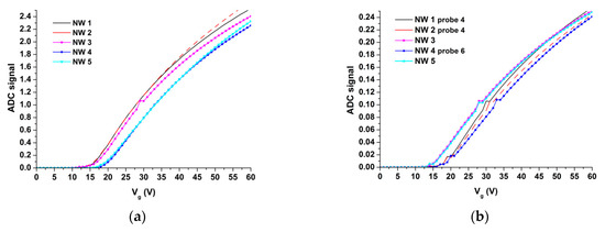 Based on the CVCs obtained, the optimal Vg value was determined to be 50 V. At that, from the comparison of Figure 4a,b, one can observe that the overall level of the current signal obtained for SOI-NS#1 sensor chip is approximately 10 times higher than that for SOI-NSs#2 due to the fact that the fabricated sensor chips initially have different technical characteristics—including the conductance level. At present, we are performing work in order to standardize the technology. The 50 V Vg value was selected according to the following considerations. In fact, the NW on the SOI substrate represents a dual-gate transistor. In this transistor, one (local) gate is a particle adsorbed onto the NW surface; the other gate (back gate) is the substrate of the SOI structure. This is why the signal from the biosensor can alter depending on the concentration of charged particles adsorbed onto the NW surface. At a lower gate voltage, the signal from the biosensor can drop down to minimum values (and even down to the noise level), thus hindering its registration.