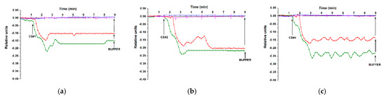 The sensograms shown in Figure 6 indicate a decrease in the electric current flowing through the probe oDNA-sensitized NSs upon the detection of model target oDNAs at concentrations from 1.1 × 10−15 M to 1.1 × 10−14 M. At that, for CS#4 oDNA at 1.1 × 10−15 M concentration, it was shown that upon its repeated detection, the maximum change in the signal level amounted to ~20% (Figure 6a, red sensogram). The decrease in the signal upon the detection of the model target oDNAs at both ultra-low concentrations (using SOI-NS#1 sensor chip) and low concentrations (using SOI-NS#2 chip) can be caused by the influence of a negative charge of the target oDNAs. This, in turn, induces an increase in the electric charge density in the vicinity of the sensor surface during the biospecific capturing of the oDNA molecules from their solution onto the sensor surface. Such an increase in the negative charge is expected to cause a decrease in the electric current through the NS. The sensograms shown in Figure 5; Figure 6 clearly indicate a decrease in the amplitude of the signal with the decreasing concentration of the model target oDNAs from 10−16 M to 10−18 M and from 10−14 M to 10−15 M, respectively. It should be emphasized that in the blank experiments, either no change in the signal was registered or the amplitude of this change was negligibly small (magenta-coloured sensograms in Figure 5; Figure 6). The results obtained confirm the occurrence of a biospecific interaction between the sensor-immobilized oDNA probes and their complimentary model target oDNAs. In addition, it should be emphasized that the minimum detectable oDNA concentration amounted to 1.1 × 10−17 M for three different model target oDNAs, which represent synthetic analogues of ASD-associated miR-106a-5p, miR-106b-5p, and miR-494-5p, respectively.