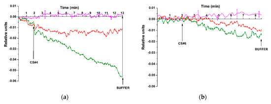 For the detection of model target oDNAs in the test solutions at higher concentrations within the range from 1.1 × 10−15 M to 1.1 × 10−14 M, another sensor chip, SOI-NS#2, was used. The test solutions containing known concentrations of either CS#4 or CS#6 model target oDNAs (which represent synthetic analogues of miR-494-5p and miR-15b-5p, respectively) were added to the working buffer in the measuring cell. This sensor chip also contained oDNA-probes-free reference NS in order to account for the non-specific adsorption. Figure 6 displays typical sensograms recorded during the detection of CS#4 and CS#6 target oDNAs in purified working buffer at concentrations ranging from 1.1 × 10−15 M to 1.1 × 10−14 M.
