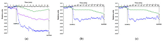 Figure 9 displays the typical sensograms recorded upon the analysis of one and the same miRNA sample isolated from the plasma of a patient with confirmed ASD diagnosis (sample No. #2) in order to illustrate the reproducibility of the results obtained with our SOI-NS and the efficiency of the regeneration of the sensor surface.