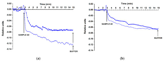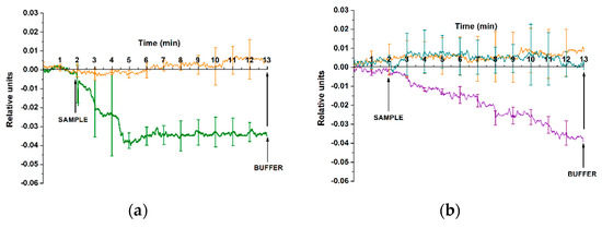 Figure 7; Figure 8 display typical sensograms recorded in the experiments on the analysis of miRNAs isolated from plasma samples obtained from either ASD patients or from healthy individuals using SOI-NS#1 and SOI-NS#2 sensor chips, respectively.