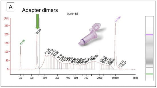 DNA quantification via qPCR was not performed on the extracts, as previous experiments had demonstrated that DNA fragments present in hair samples of considerable age are generally too small to yield a 105 bp amplicon with the mtDNA qPCR assay routinely used in DSU [12,14]. Although fluorometric quantification was attempted using a QubitTM Fluorometer and a dsDNA High Sensitivity Assay Kit (Invitrogen, Waltham, MA, USA), no dsDNA could be detected. The final concentration of the adapters was arbitrarily set at 300 nM.