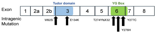 Five intragenic mutations were identified in six patients. All of the patients had been reported elsewhere [19,20,22,27,28,29,30], and clinical information on each patient is summarized in Table 1. Mutations of Patients 1, 2, 4, 5, and 6 were analyzed in our laboratory. Patient 3 with c.400 G > A mutation (p.Glu134Lys substitution) was not one of our own patients [30], but was included in this study as a typical case of mutated Tudor domain; the disease severity and the results of molecular genetic analysis were reported previously [27,30].