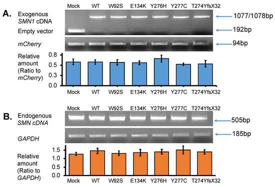 SMN transcript analysis. (A) Exogenous-SMN1 cDNA analysis of empty vector (Mock), wild-type (WT) SMN, and mutant-type SMN cDNA constructs (W92S, E134K, Y276H, Y277C, T274YfsX32) transfected into HeLa cells. One clear band of ~1000 bp was detected for all SMN cDNA constructs. In the Mock, a band of ~200 bp was detected, which was derived from the empty vector transcript. The pmCherry transcript was used for normalization. The amounts of the exogenous SMN1 transcript relative to pmCherry transcript were calculated for comparison. It should be noted that transfection and transcription efficiencies were similar in all the constructs transfected into HeLa cells. (B) Endogenous-SMN cDNA analysis of HeLa cells transfected with empty vector (Mock), wild-type (WT) SMN, and mutant-type SMN cDNA constructs (W92S, E134K, Y276H, Y277C, T274YfsX32). Endogenous SMN cDNA encompassing exon 6 to exon 8 was amplified in this study. The amounts of the endogenous SMN relative to GAPDH were calculated for comparison. It should be noted that the introduction of these constructs did not affect the expression of endogenous SMN genes in HeLa cells. Each experiment was performed in triplicate and the data are presented as the mean ± SD.