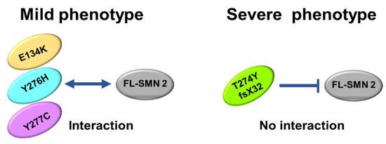 The number of patients analyzed in this study was very limited, but our analysis suggested that the oligomerization ability of the mutated SMN1 protein, which is linked to interaction with FL-SMN2 protein, may be a determinant of the clinical severity of SMA (Figure 6).