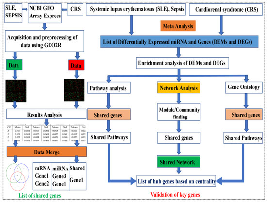 Sepsis is a cause of high mortality and morbidity even in the most developed and wealthiest countries. Globally, 31.5 million patients with sepsis and 19.4 million instances of severe sepsis are expected to be diagnosed each year, with 5.3 million deaths possible [1]. In sepsis, the abrupt release of cytokines by the innate immune system may cause multiorgan failure, leading to septic shock and associated complications, including CRS [2,3,4] and an autoimmune disease known as SLE [5,6,7]. Cardiovascular injury and acute kidney injury (AKI) have been shown to be independent risk factors for increased mortality [8]. Combined cardiac and renal dysfunction amplifies the progression of failure in the individual organ, ultimately leading to the failure of both organs (heart and kidney), often referred as CRS, while SLE is a systemic autoimmune disease that occurs primarily due to poor efferocytosis, uncontrolled complement activation, complex immune redundancy, and systemic inflammation [9]. To avoid the unnecessary and tedious usage of antimicrobial drugs in sepsis, early and distinctive detection is required. Conventional biomarkers for sepsis, SLE, and CRS are not accurate and adequate due to the chance of false positive results and delayed detection [10,11,12]. Therefore, more reliable biomarkers for early detection and appropriate therapeutic targets are needed to decrease risk assessment. Elevated inflammatory cytokines, such as TNF-α, IL-1β, and IL-6, during sepsis do not provide specific information regarding the development and severity of the disease, and hence considering them as specific disease clinical markers is not suitable [13]. It has been reported that patients with sepsis and SLE can develop type 5 CRS, where all of these disorders can lead to disease in the heart and kidneys [14]. The severity of the illness, the occurrence of septic shock, and mortality are greater in patients with septic CRS-5 compared with patients who only have sepsis [2]. All vital organs of the body share biological information, which is termed organ cross-talk. CRS is an important example of organ cross-talk, whereby interdependency exists between the function of the kidney and heart and vice versa [9,15,16] Mostly, CRS is associated with cardiovascular disease (CVD) and chronic kidney disease (CKD), both of which are intimately linked. Early detection and effective treatments are the only ways to lower the death rates caused by chronic diseases [17]. Due to the slow progression of chronic diseases (CDs), it is critical to make an early diagnosis and administer efficient treatment. As a result, it is critical to develop a decision model that may aid in the diagnosis of CDs and the prediction of future patient outcomes [18]. We choose a broad term using the plural CRS to indicate the presence of multiple syndromes. For instance, in sepsis-induced acute CRS-5, there is a fulminant disease process that has a dramatic impact on both the kidneys and heart [19]. The microarray data profiling of sepsis, CRS, and SLE, and extensive gene techniques, have been used to identify differentially expressed genes (DEGs) [20,21,22,23]. Incorporating, integrating, and re-analyzing existing data using bioinformatics tools can provide new strategies, methods, and relevant information. In network biology, there are numerous approaches to this [18].