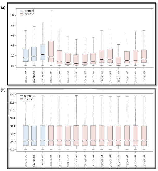 Figure 2. Boxplot of GSE94717. For all GSE series, the boxplot indicates data noise/data duplicity and normalized/non-normalized data. If the data are not normalized, the whisker boxes are up and down (not in proper lines). If data are random due to noise mixing or redundancy, data should be normalized in order to solve this problem. If data are non-normalized, there may be false results; the upregulated genes may be portrayed as downregulated, and vice-versa. After data are normalized, we can rely on the data, and consider the DEGs for further studies. The blue color box plot shows the normal samples and the pink color box plot shows the disease samples. In the boxplot, we can see the number of samples and the GSM number of the GSE series (if the GSE series selection was wrong, then the 12 disease samples and the 3 control samples will also give false results). The pre-processing of the data is an essential step for data accuracy when working with manipulated data. The Y-axis of the boxplot indicates a range of data values, and the X-axis indicates data samples in the GSE series. (a) Non-normalized data; (b) normalized data.